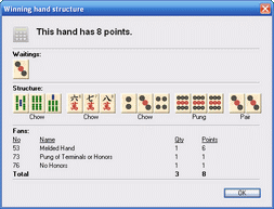 - по завершению розыгрыша можно посмотреть структуру выигрышной руки с указанием всех полученных фанов и очков